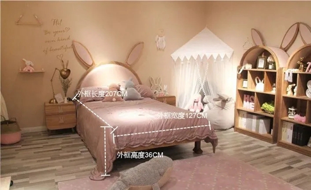 這款床以活潑可愛和簡單的米菲兔造型來展現,相應的兔子元素、粉色系搭配一致,易于記憶、簡樸、親切。藕粉色和原木色的碰撞給人一種舒適。